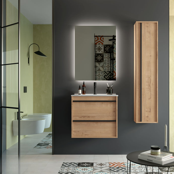 Attila Noir 600mm Wall Hung Basin Unit with Matt Black Handles - Ostippo Oak