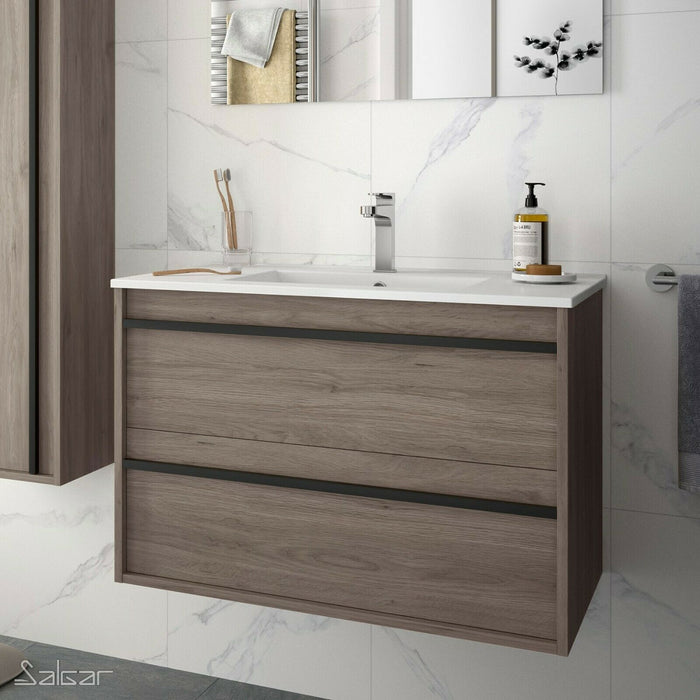 Attila Noir 800mm Wall Hung Basin Unit with Matt Black Handles - Eternity Oak