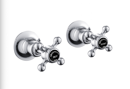 JTP presents the Grosvenor range featuring the black wall mounted cross wall valves. Key Features: Brass with chrome finish + black cross Water P...
