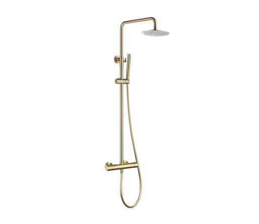 Sphere square thermostatic shower column with 200mm fixed head, hand set and bar valve. Finished in a stylish brushed brass fin...