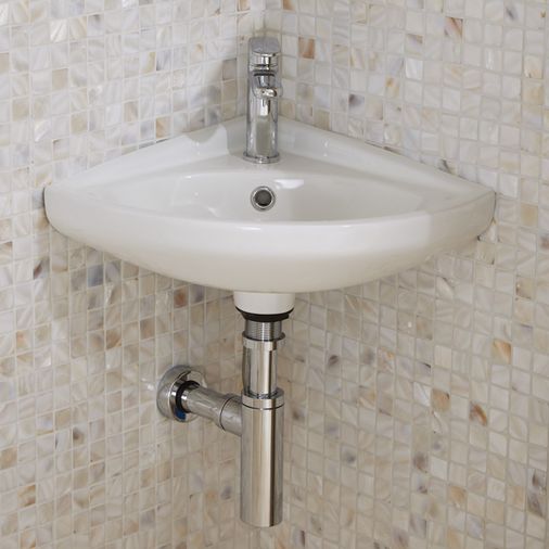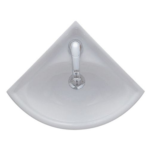 This white porcelain compact corner basin has one tap hole and is perfect for cloakrooms as a space saving basin.