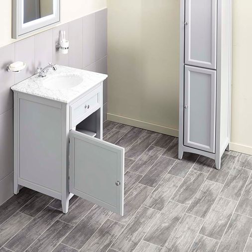 If you favour a classic approach to your bathroom design, the Savoy Gun Metal Grey single door unit & 1 tap hole marble top & ceramic under counter basin offers a more traditional touch. The vanity unit has a Gun Metal Grey finish which contrasts our white sanitaryware beautifully. Designed to give your bathroom a sense of deep colour and elegance whilst also providing good storage space.