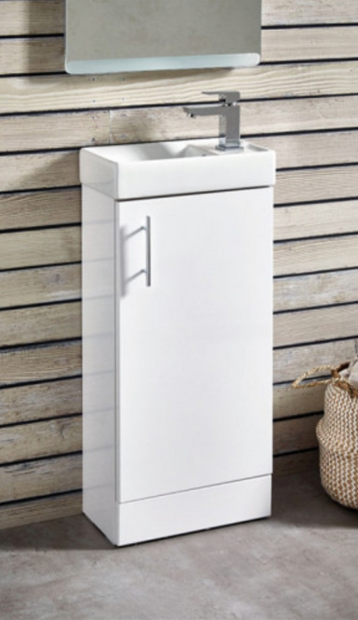 Lanza White 400 Floor Standing Cloak Vanity with Basin Key features: 18mm solid carcass Soft close doors 1 Tap hole Ceramic Basin Door can be hun...