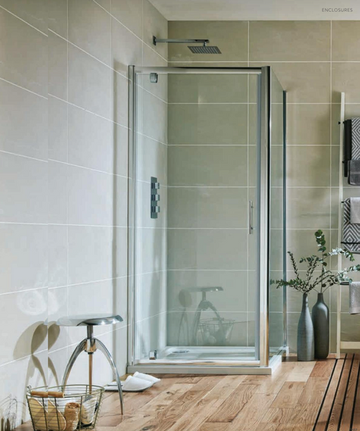 Vantage Silver Pivot Door Shower Enclosure 760mm Key features: Silver Finish 6mm Tempered Glass 2000mm High 10 Years Guarantee Easy Clean