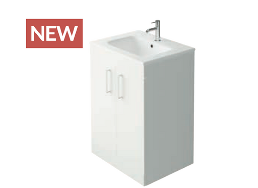 Aquatrend Gloss White 455 Cloak Vanity with Basin Key features: Available in 5 Finishes 455 x 840 x 275mm Includes Chrome Handles 2 Drawer Unit
