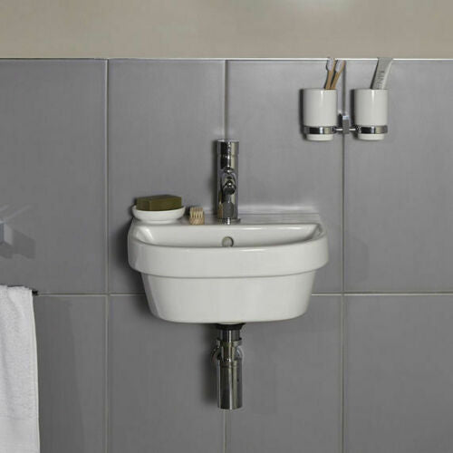 This white porcelain compact corner basin has one tap hole and is perfect for cloakrooms as a space saving basin. Features and Benefits Spa...