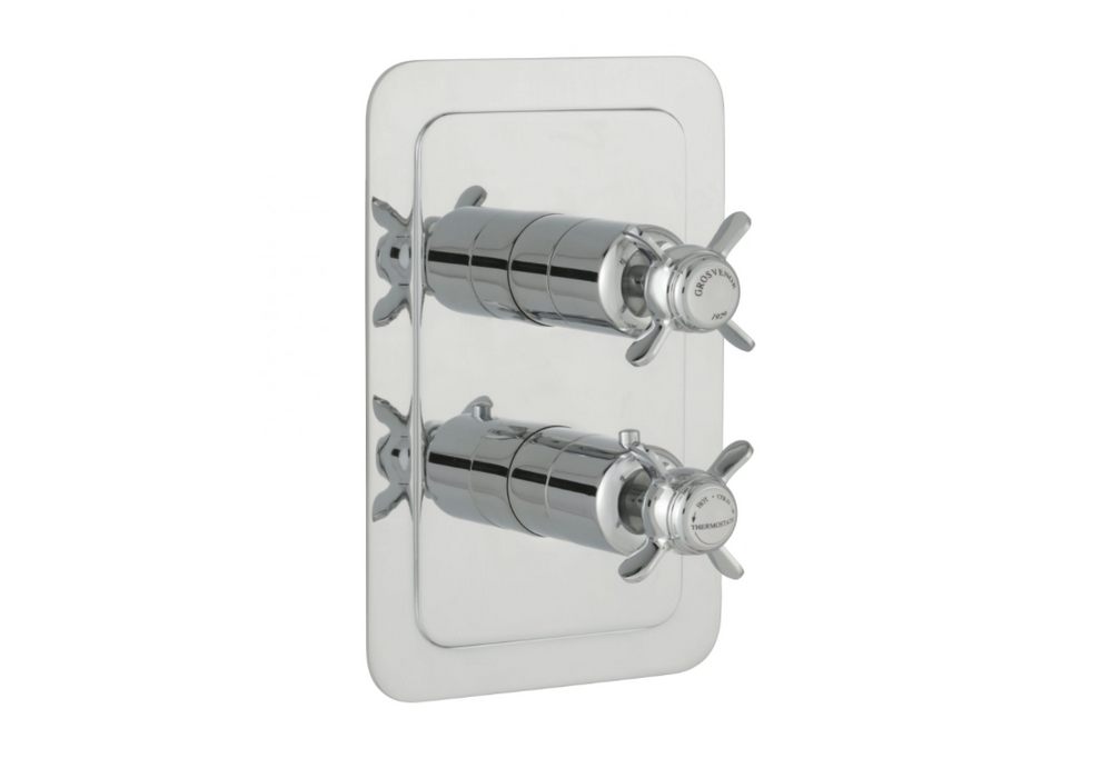 JTP presents the Grosvenor Pinch range featuring the chrome cross lever thermostatic concealed outlet shower valve, vertical available in 1 or 2 outlets.