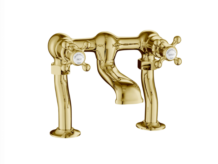 JTP presents the Grosvenor range featuring the cross antique brass edition deck mounted bath filler.