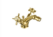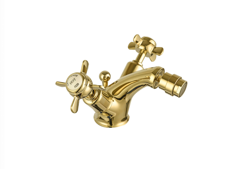 JTP presents the Grosvenor range featuring the cross antique brass edition bidet mixer with pop up waste.