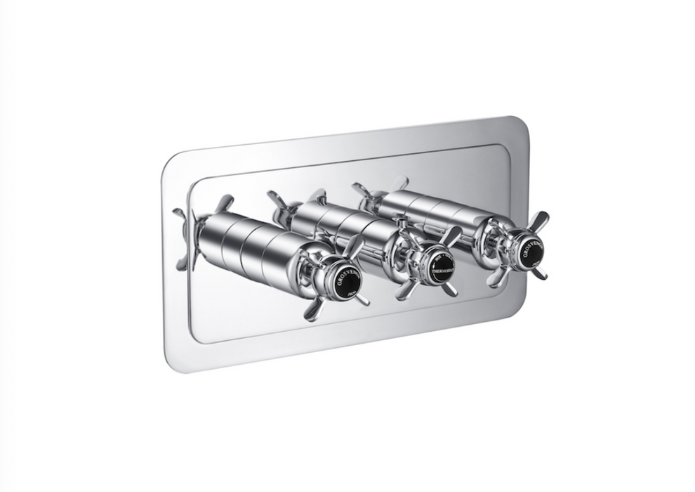 JTP presents the Grosvenor Pinch Black Edition range featuring the chrome cross lever thermostatic concealed outlet shower valve, horizontal available in 2 or 3 outlets.