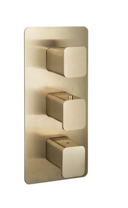 The HIX Thermostatic Concealed 3 Outlet Shower Valve features a minimalist Brushed Brass finish 3 square design perfect for a concealed arrangement for a shower.
