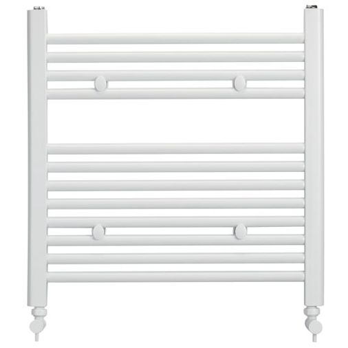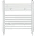 The Optim straight 600 x 600 white towel radiator is ideal for placing underneath a window in the bathroom. The rails are straight (as opposed to curved). It is tested to EN442 at a temperature of delta 50 degrees.