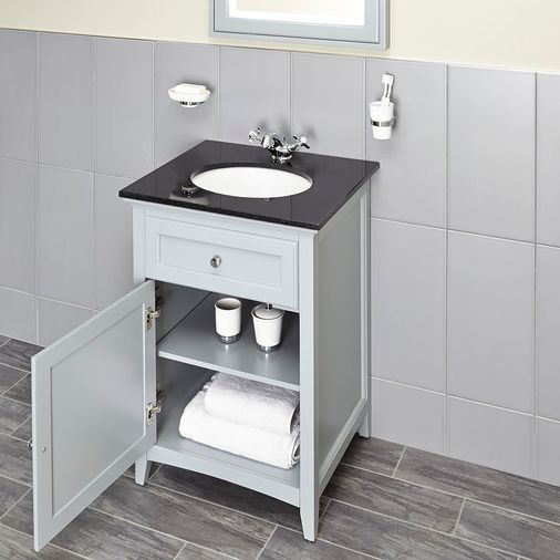 If you favour a classic approach to your bathroom design, the Savoy Gun Metal Grey single door unit & 1 tap hole granite top & ceramic under counter basin offers a more traditional touch. The vanity unit has a limited edition Gun Metal Grey finish which is meant to contrast our white sanitaryware. Designed to give your bathroom a sense of deep colour and elegance which doesn‰۪t clash alongside your other bathroom fittings.